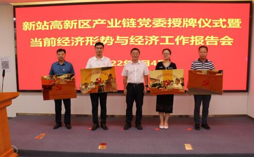2022年8月,新站高新區(qū)舉行產(chǎn)業(yè)鏈黨委授牌儀式暨當(dāng)前經(jīng)濟(jì)形勢(shì)與經(jīng)濟(jì)工作報(bào)告會(huì),圖為區(qū)黨工委委員、管委會(huì)副主任高同國(guó)向區(qū)集成電路、新型顯示、高端裝備制造、節(jié)能環(huán)保四大產(chǎn)業(yè)鏈黨委授牌